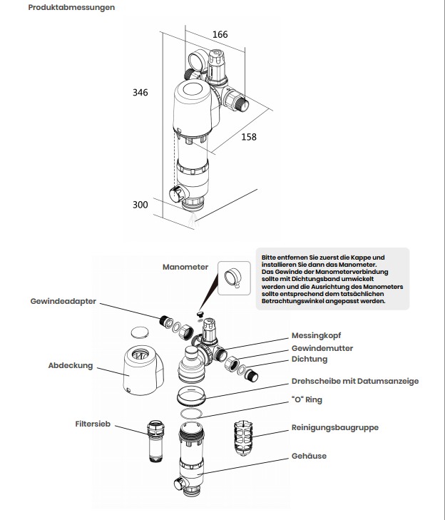 - Jährliche Reinigung: Das Filtersieb muss ca. einmal im Jahr zerlegt und gereinigt werden. Verwenden Sie für die Wartung immer Originalersatzteile.